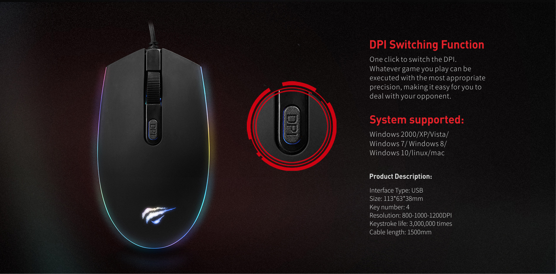 1.Three gears of mouse adjustment(800-1000-1200DPI), enables freely switching in game.