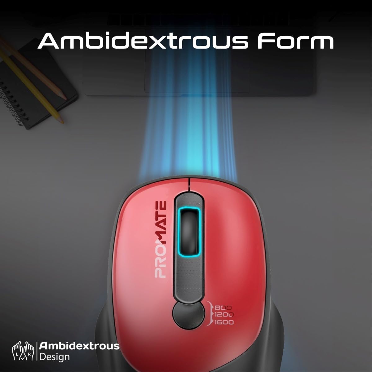 Promate Wireless Mouse, EZGrip Ergonomic Ambidextrous 2.4GHz Mice, Adjustable 1600DPI, 6 Million Keystrokes, Nano USB Receiver, 10m Range –