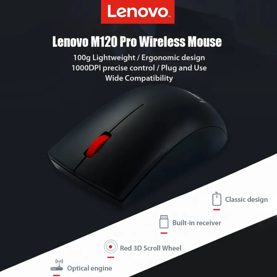 Lenovo M120 Pro Wireless Mouse 2.4GHz With USB Interface Lightweight Ergonomic Optical Wireless Mouse For PC Or Laptop